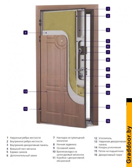 Со стороны петель, в торце полотна имеются противосъемные штыри – 3 шт., не позволяющие открыть полотно при срезании петель.