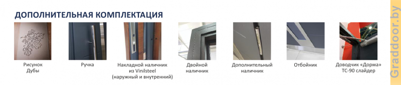 | Входит в цену - Полотно укомплектовано двумя накладками на порог, из нержавеющей стали которые крепяться после монтажа двери. Одна панель порога брендирована. |