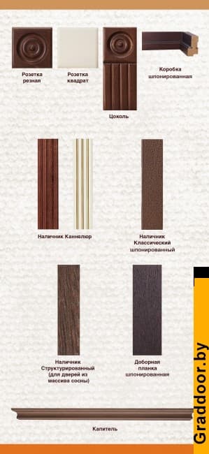 Дополнительная информация Размеры 800x2000х40 (доп. стоимость), 900x2000х40 (доп. стоимость) За наличник с каннелюром и за телескопический наличник - доп. стоимость Возможно изготовление нестандартных размеров - доп. стоимость | |