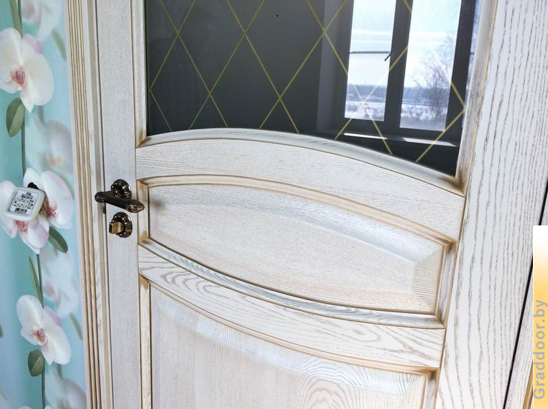 Данная модель может быть представлена в индивидуальном цвете и оттенке, с различным видом патины. Такие двери придутся по вкусу покупателям, которые предпочитают и ищут двери в классическом стиле. Двери обладают высокой твердостью поверхности, экологичностью, ударопрочностью, долговечностью и отличным качеством. Собираются при помощи стяжных винтов и комплектуются уплотнителем фирмы Schlegel. При изготовлении дверей нами затрагивается весь технологический процесс от закупки пиломатериала, распила и сушки до покраски дверного блока. Мы используем только массив ценных пород древесины без пороков и дефектов. Двери могут быть выполнены из массива сосны, ольхи, дуба и ясеня. Филенки изготавливаются при помощи ламелей из древесины, а внутри используется Влагостойкая плита, что дает идеальную геометрию. Для склейки древесины мы используем немецкий клей группы D4. Покраска дверей происходит в разобранном виде, что в дальнейшем не приводит к образованию белых полос нежели при покраске целиком.